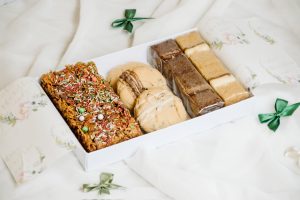 To complete the box, there’s a slice each of our chocolate & hazelnut cake and Biscoff cake, both rich, soft and beautifully layered with creamy filling.